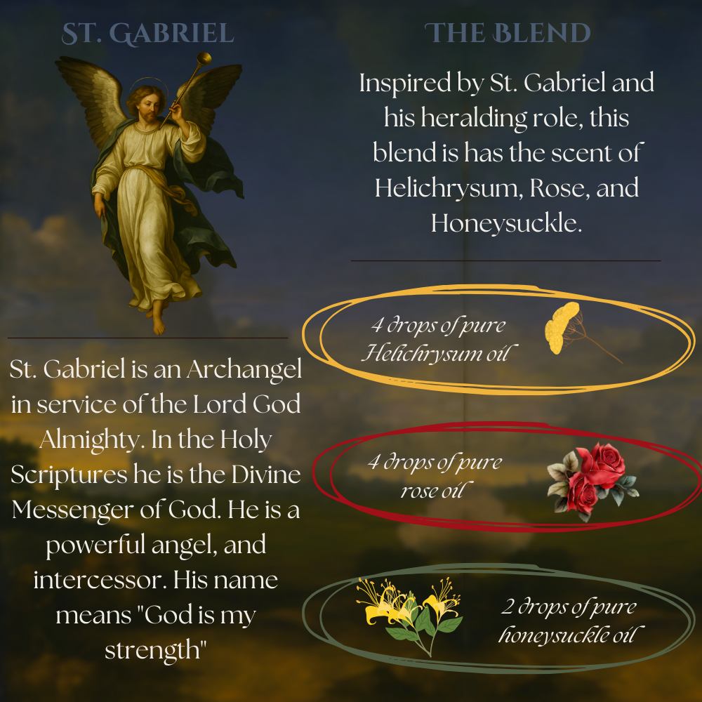 Glass 2oz bottle of beard oil. Inspired by St. Gabriel and his heralding role, this blend is has the scent of Helichrysum, Rose, and Honeysuckle.