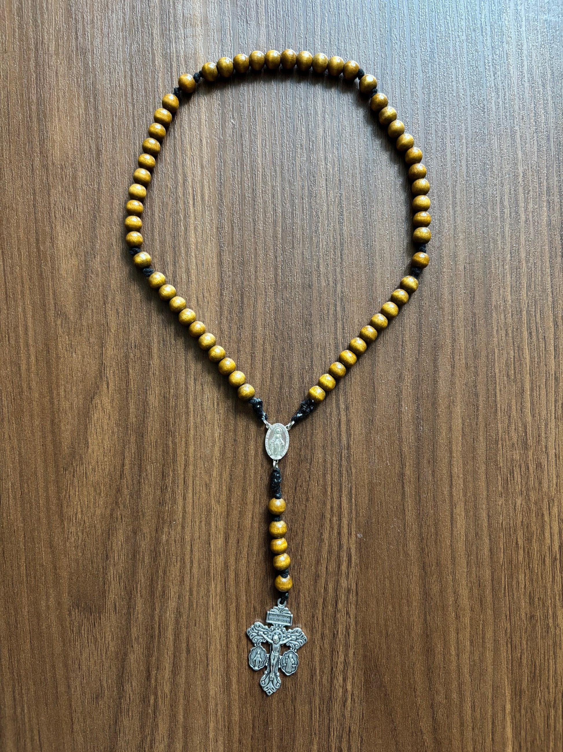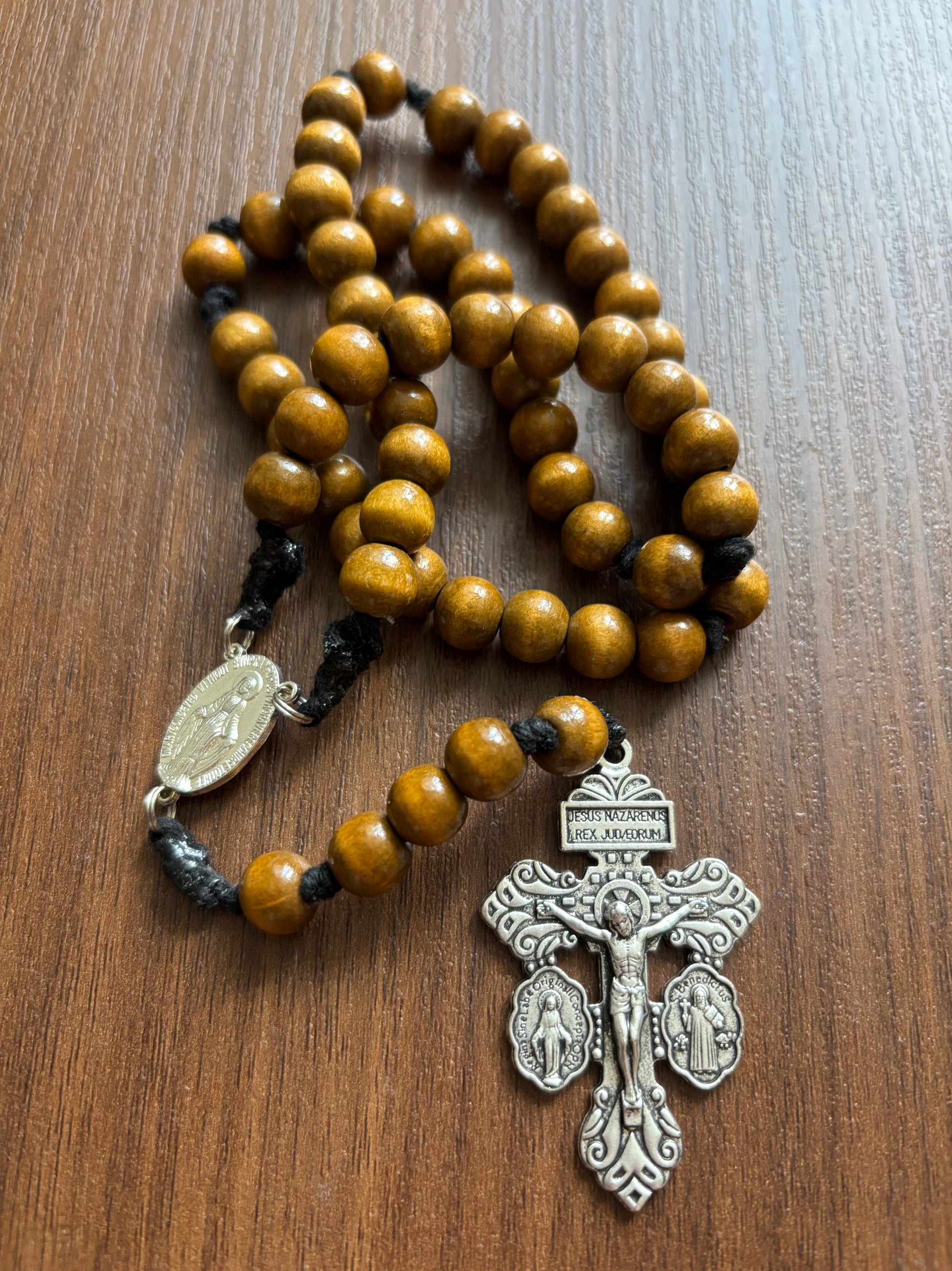 A 5 decade full rosary made from the wooden beads and silver medals.