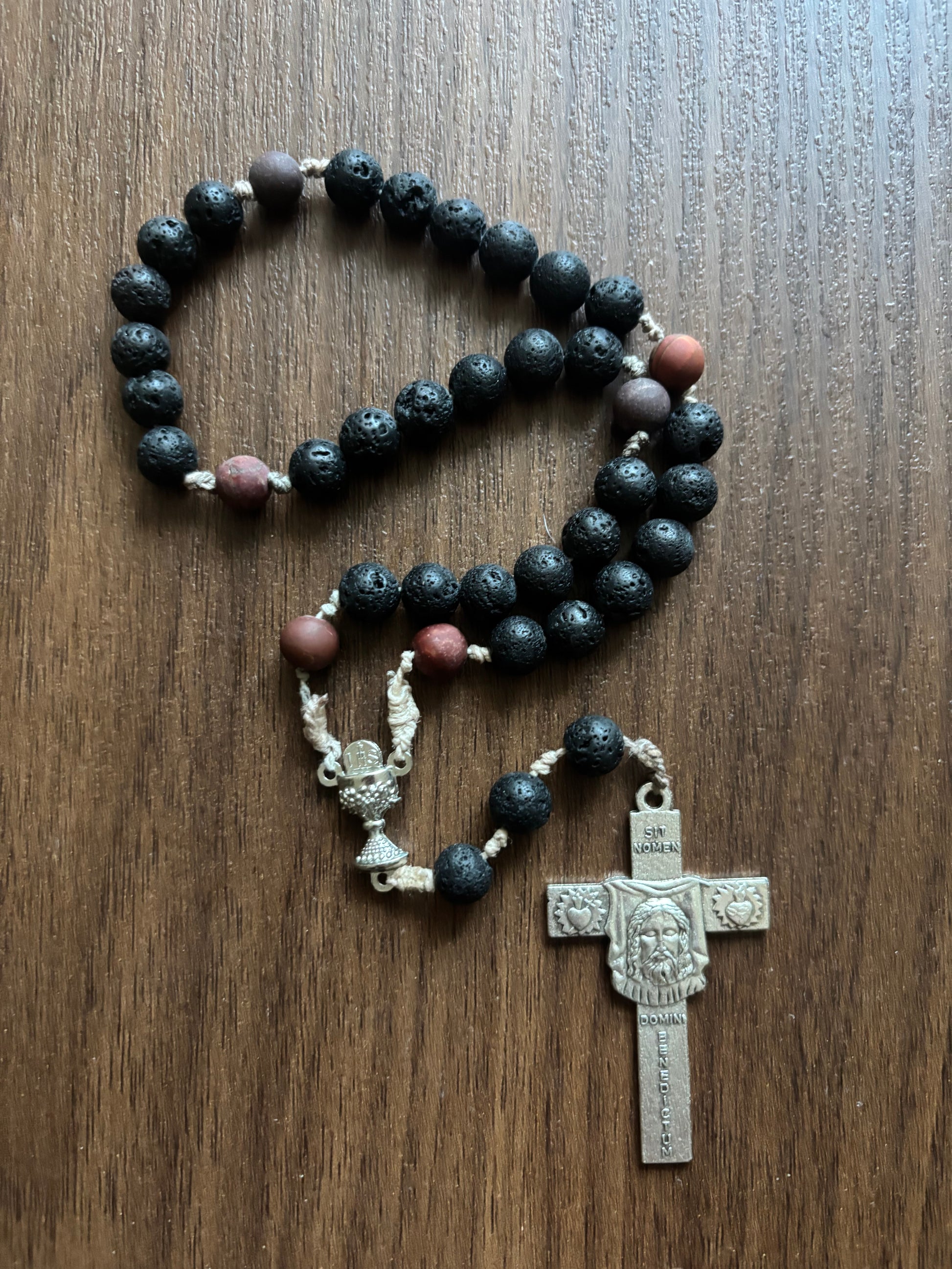 The Holy Face Chaplet with prayer guide. Magma Rock beads, silver crucifix, and sturdy rope.
