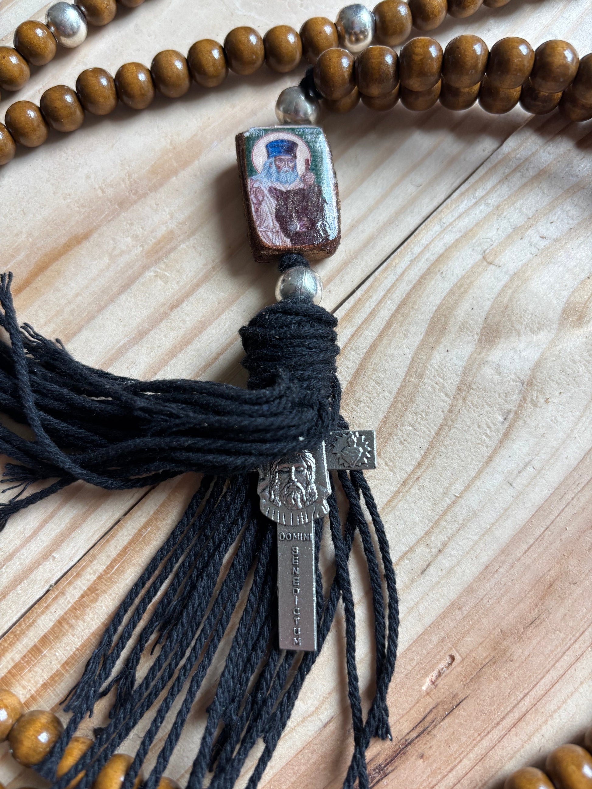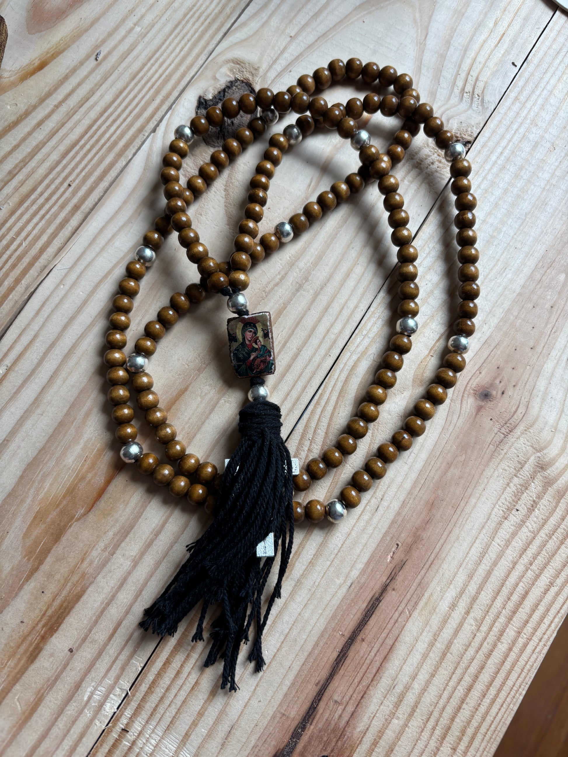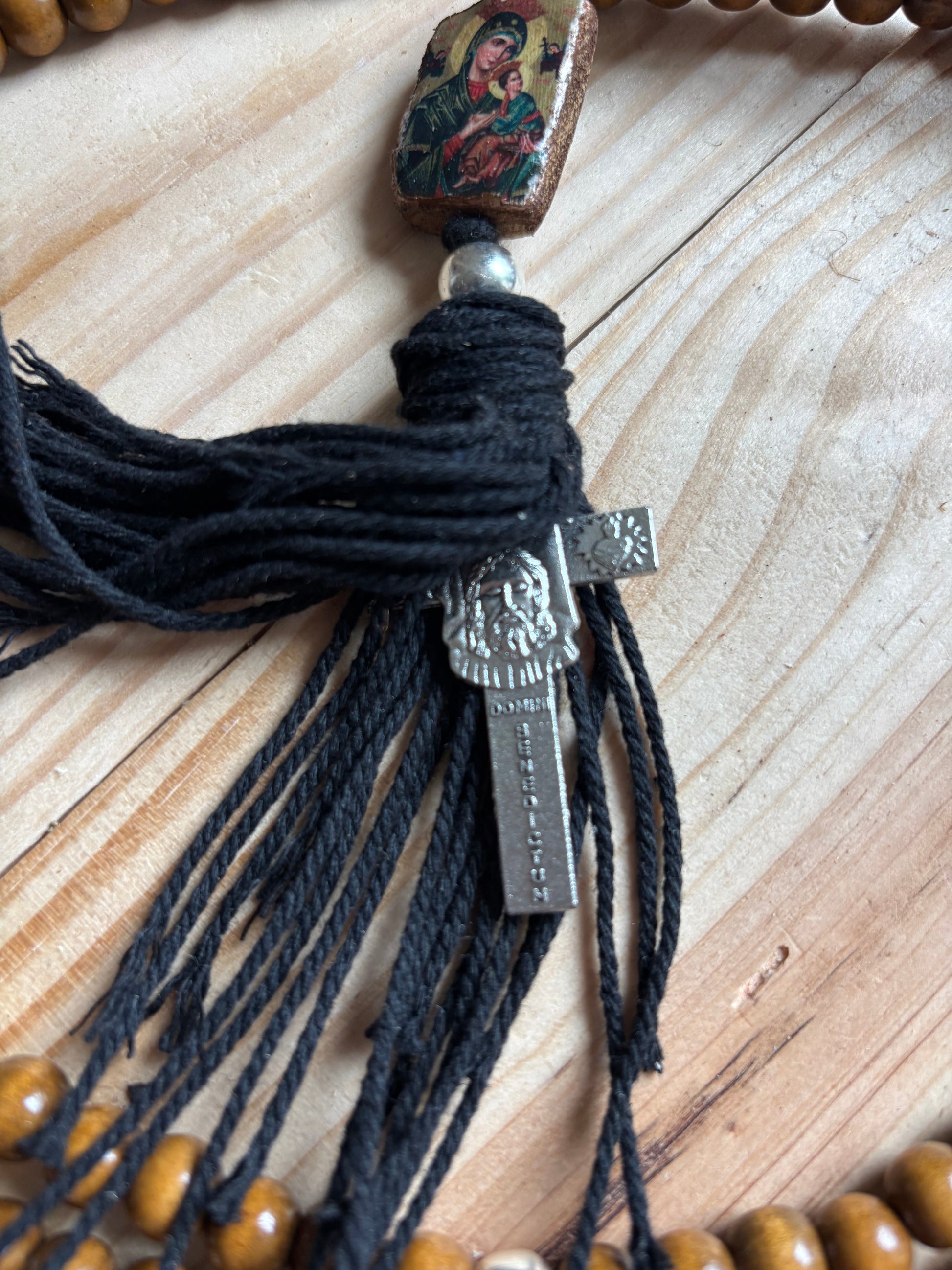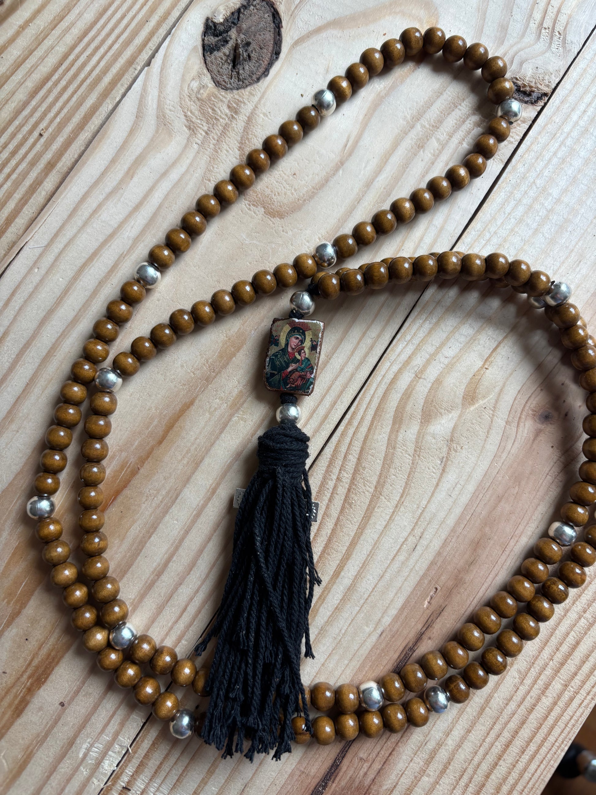 A handmade prayer rope, made with cord, wooden & metal beads, and a handmade printed icon. 222 beads, chakra, icon, and Holy Face crucifix. Icons have our Lady of Perpetual Help image, and a Saint of your choosing.