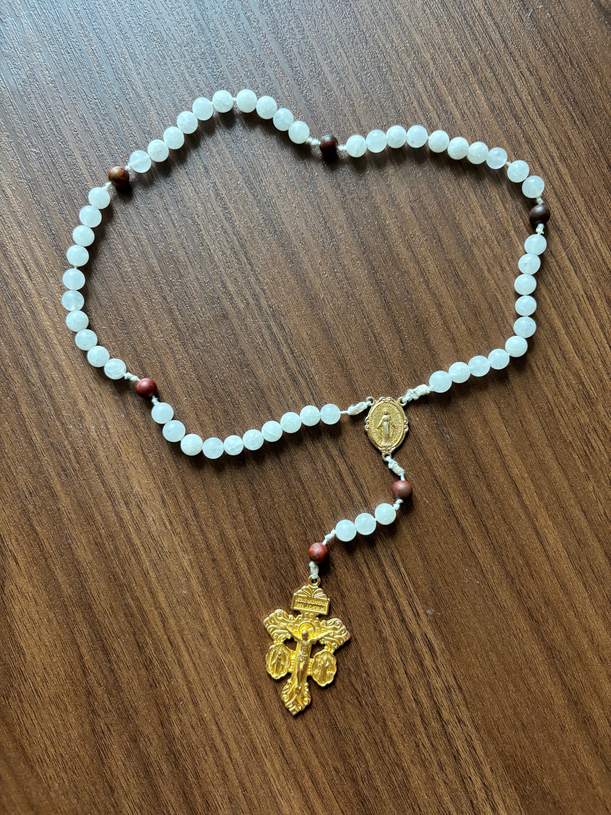 A five decade rosary made from the white matte finish stone, red and brown beads, and gold medals. This Rosary is inspired by the Holy Spirit, the Burning Bush, and the Sacrament of Confirmation.